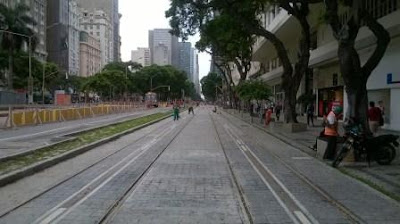 | PRAÇA MAUÁ: Linha do VLT implantada. Ao fundo, a Avenida Rio Branco. Foto Axel Grael. |